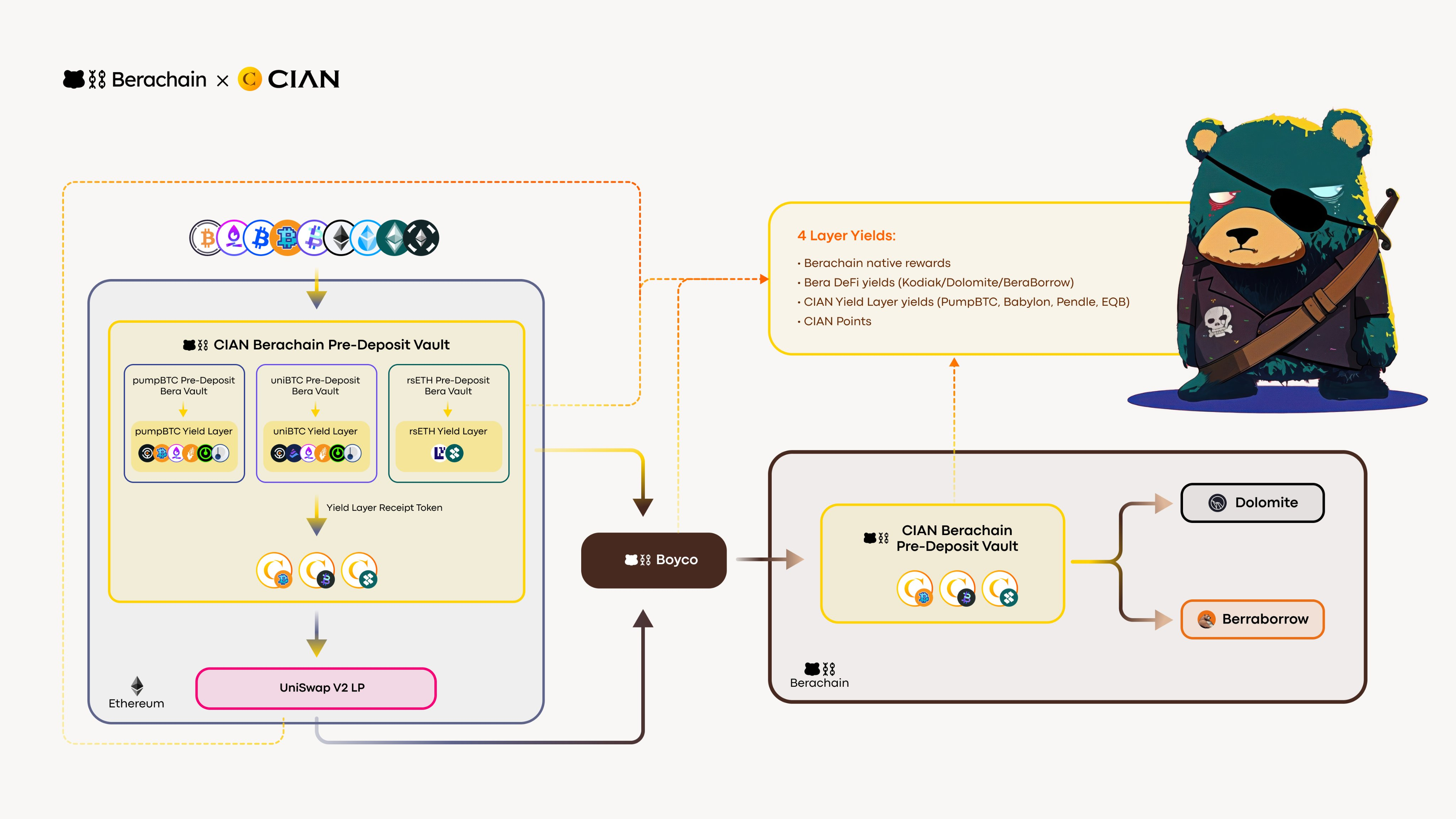 Berachain Pre-Deposit Vault by CIAN provides the most feasible way for rsETH/wBETH/pumpBTC/uniBTC/cbBTC/USDa holders to get early access to Berachain incentives from ETH mainnet. Berachain has a Boyco campaign which runs for 3 months to reward early tvl providers and only whitelisted assets can participate. Berachain Pre-Deposit Vault by CIAN successfully got whitelisted on major DeFi primitives including Kodiak, Dolomite, and Beraborrow.
