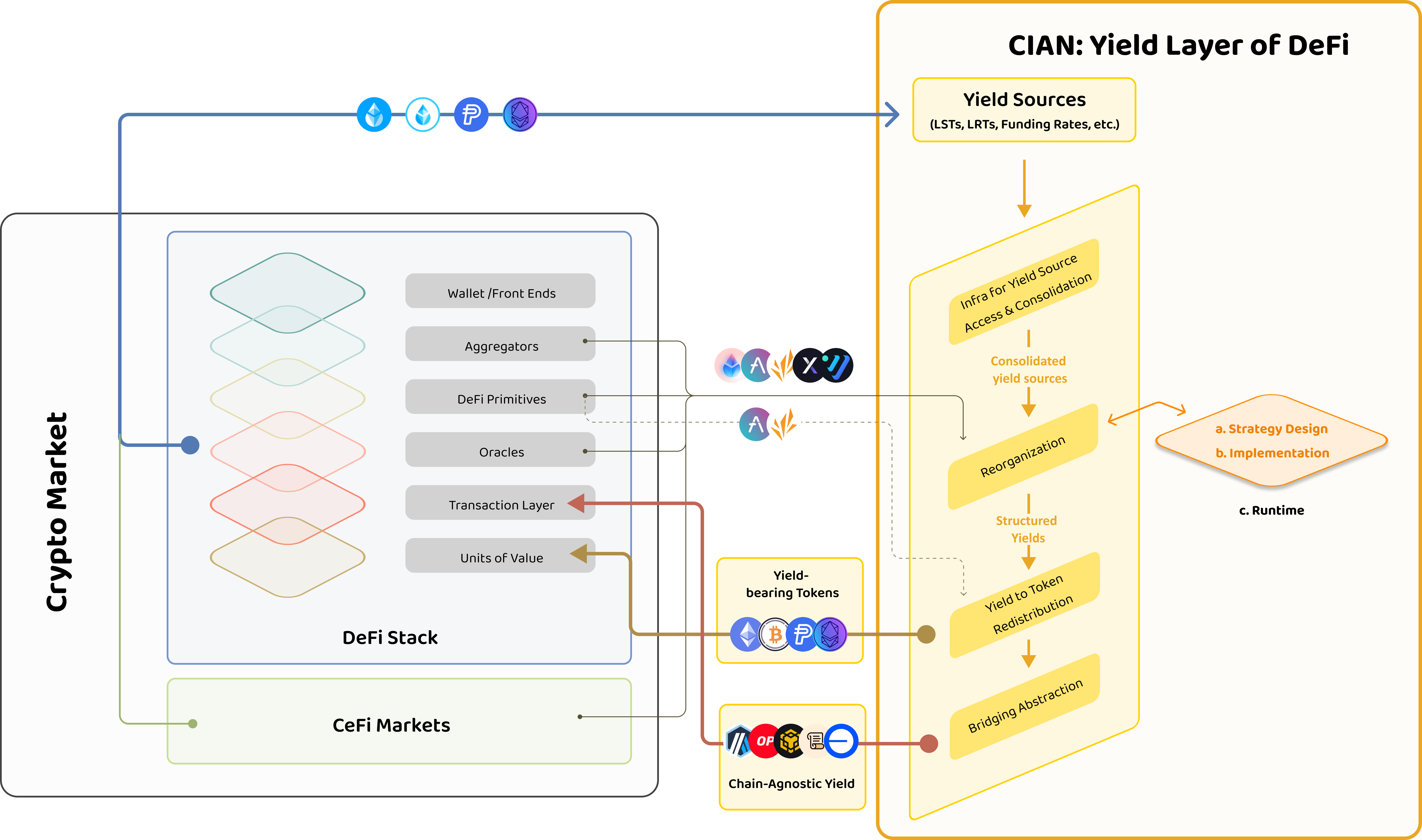 The Yield Layer is a virtual layer that consolidates secure, scalable, and sustainable yield sources across the entire crypto space, reorganizes them into structured yields, and redistributes the yields to a multitude of tokens and networks. The objectives are: