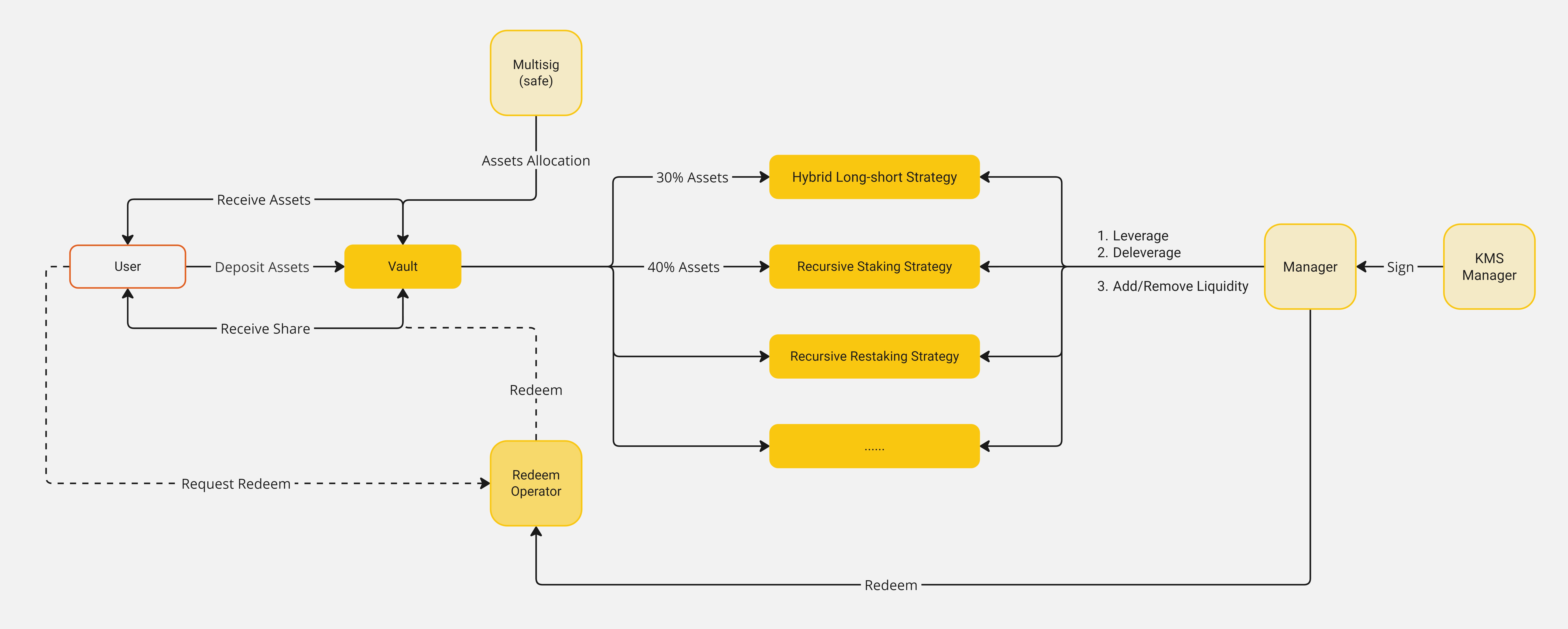 The MultiSig module is designed to enhance security and transparency within the system. It requires multiple signatures to approve significant actions (e.g. adjusting asset allocation parameters), ensuring that no single entity can control the assets without consensus.